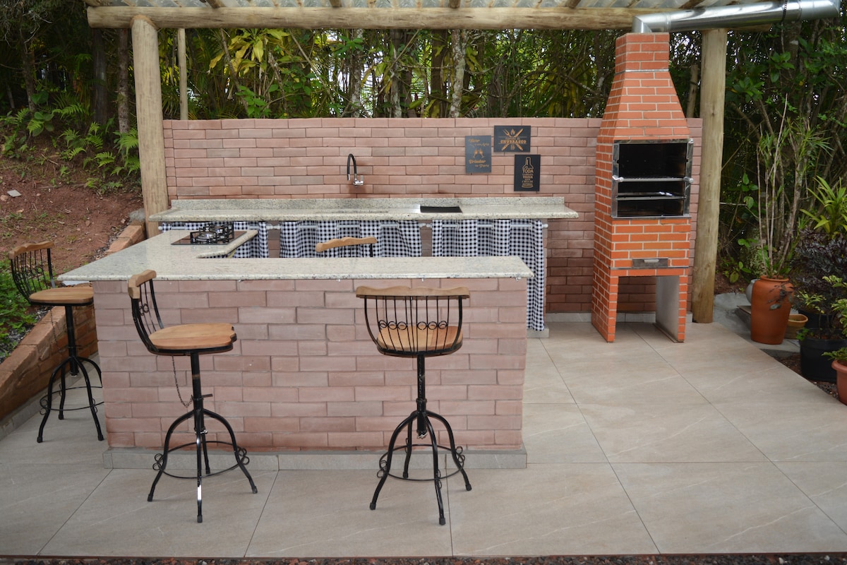 Seo chugaibh teach cluthar, agus áilleacht nádúrtha na tuaithe thart air. Tá balcóin mhór, seomra suí cluthar ina bhfuil teallach, cistin fheistithe, trí sheomra leapa compordacha agus seomraí folctha iomlána ann. Lasmuigh le linn snámha, áit don mbeárbaiciú agus gairdín dea-chothaithe. Foirfe dóibh siúd atá ag lorg saoire ciúine shuaimhnigh faoin tuath. Suite ar bhóthar Cunha-Paraty ag km 64.3, le stráice 1,400 méadar de bhóthar cré.