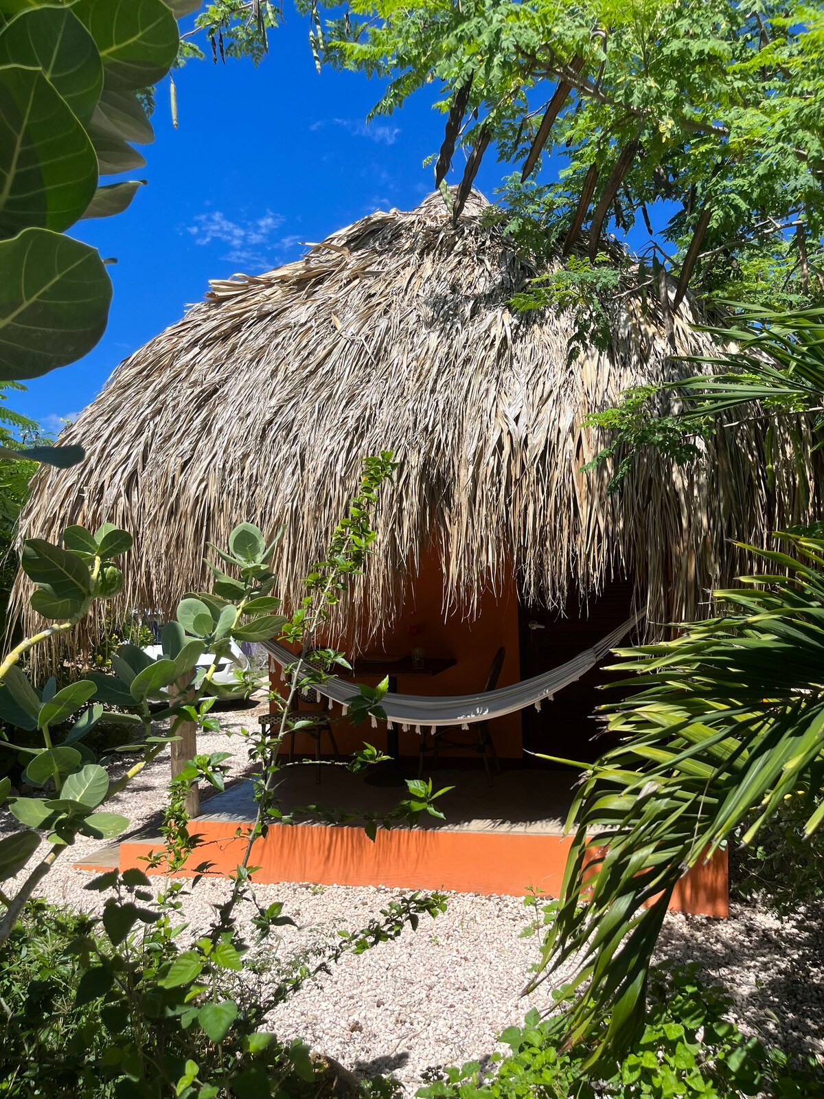 Laid out in an enclosed tropical garden with (palm) trees, exotic flowers, colorful birds, hummingbirds and butterflies. There is also a swimming pool (6 meters) with sun loungers and various seating areas. The domain is located by the sea, but there is no direct access. The idyllic beach Playa Wachi, where you can also enjoy snorkeling, is a 5-minute walk away. Tropical cabin with palm leaf roof, one bedroom, bathroom and shared kitchen. Part of the colourful eco-resort, De Octopus