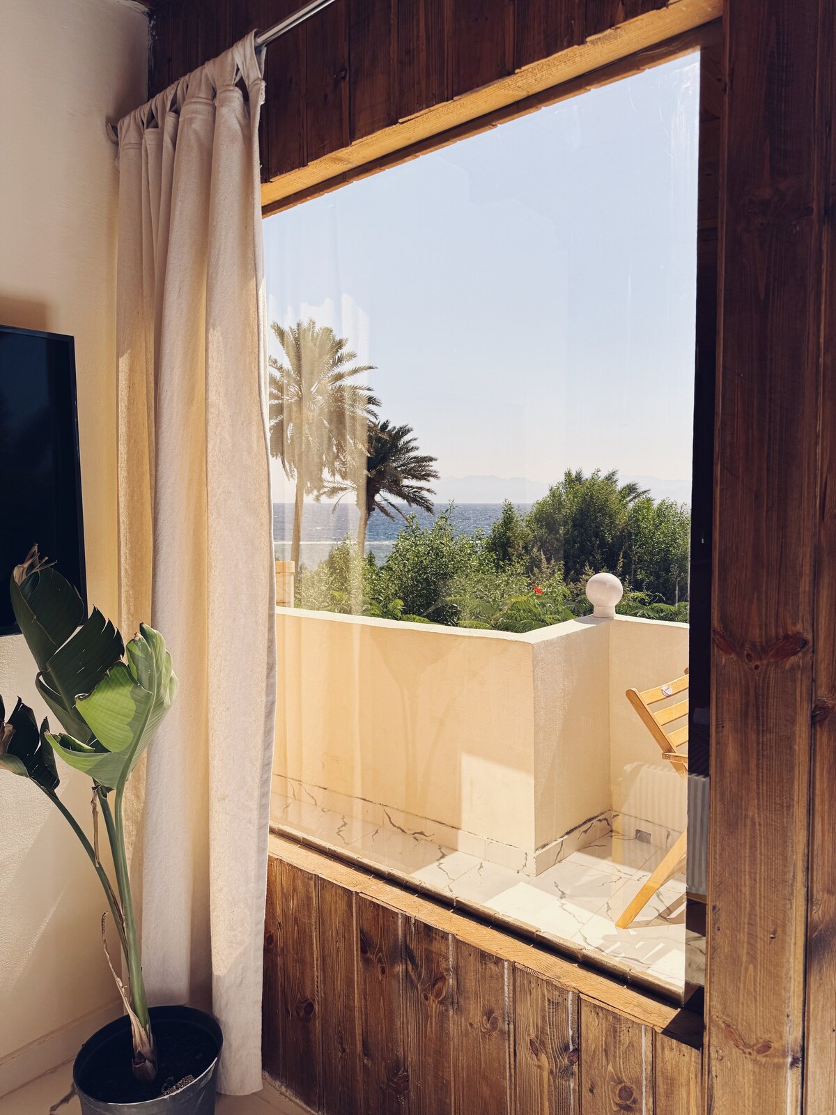 Fáilte go dtí do theach teolaí as baile in Dahab! Lonnaithe ar an gcéad urlár, tá radhairc áille den fharraige ar fáil san árasán ‘Farraige’ trí bhrainsí pailme agus gathanna gréine, díreach mar a thaispeánann an pictiúr. Tá an t - árasán fairsing 1 sheomra leapa seo lán le troscán agus oiriúintí lámhdhéanta a léiríonn an stíl mhaireachtála orgánach agus nádúrtha is breá linn in Dahab. Suite ar an dara líne go díreach cois trá, níl ann ach siúlóid 3 nóiméad go dtí margadh Assala agus siúlóid 10 nóiméad go dtí an Teach Solais.