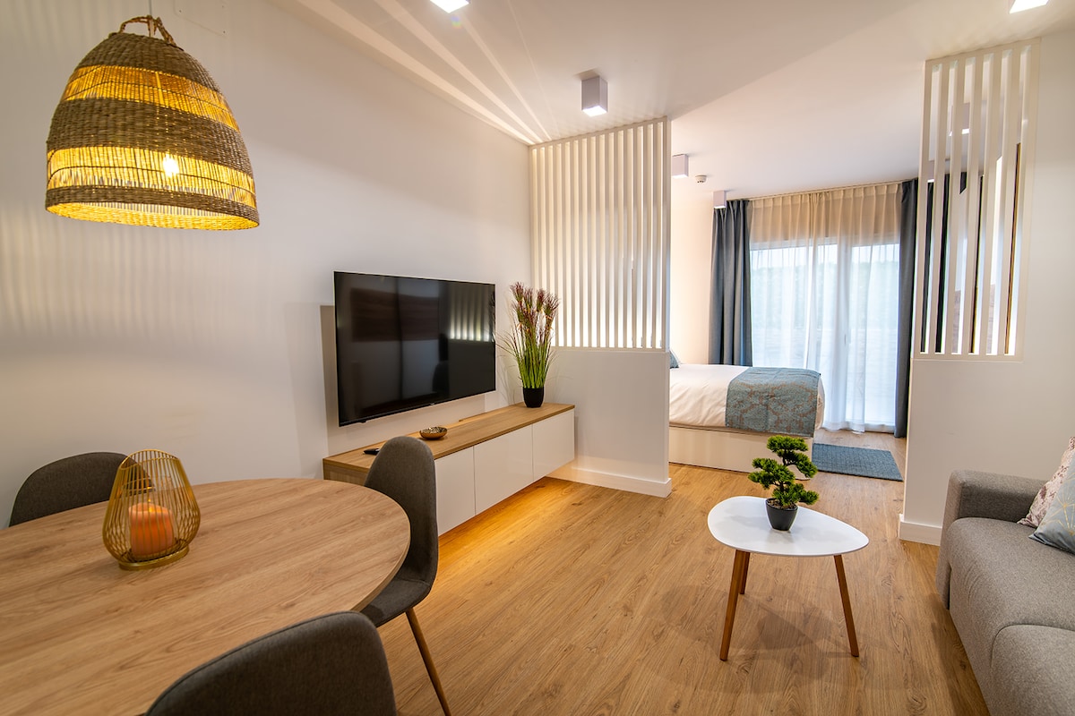 Árasán ag breathnú amach ar na muilte, tá 3 sheomra leapa ann, 2 leaba dhúbailte 1.50 méadar, seomra leapa eile ina bhfuil dhá leaba 1.05, agus seomra suí ina bhfuil tolg leapa, agus teallach. Tá 2 sheomra folctha nua-aimseartha fhairsinge ina bhfuil cithfholcadán san árasán. Tá sorn, meaisín níocháin, miasniteoir, cuisneoir, micreathonnán, gléas caife, tóstaer, srl. sa chistin. Wi-Fi saor in aisce, páirceáil phríobháideach saor in aisce agus ardaitheoir. Is féidir leat dul suas go dtí an lochtán coiteann ar an 3ú hurlár.
