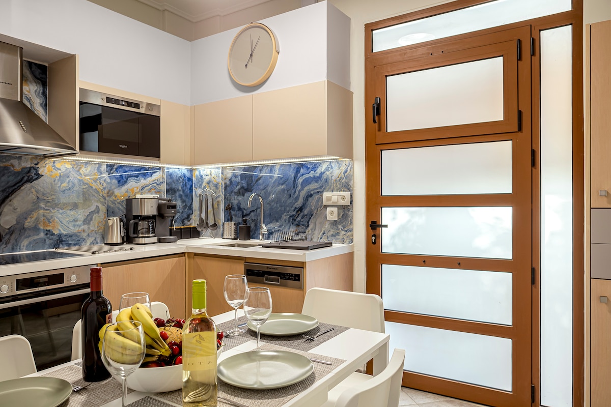Lóistín nua - aimseartha, fairsing agus nua - athchóirithe dóibh siúd a bhfuil suaimhneas á lorg acu ar shiúl ón gcathair agus in aice leis an bhfarraige, ach ag an am céanna, nach bhfuil i bhfad ar shiúl ó radharcanna lár na cathrach. Díreach 10 nóiméad ar shiúl na gcos tá ceithre thrá áille, lán - eagraithe, a bhronntar le deimhnithe "Bratach Ghorm" gach bliain. Ina theannta sin, níl ach 15 nóiméad ar shiúl sa charr nó sa bhus tá lár na cathrach in Chania, lena "Seanbhaile" stairiúil agus Cuan na Veinéise.
