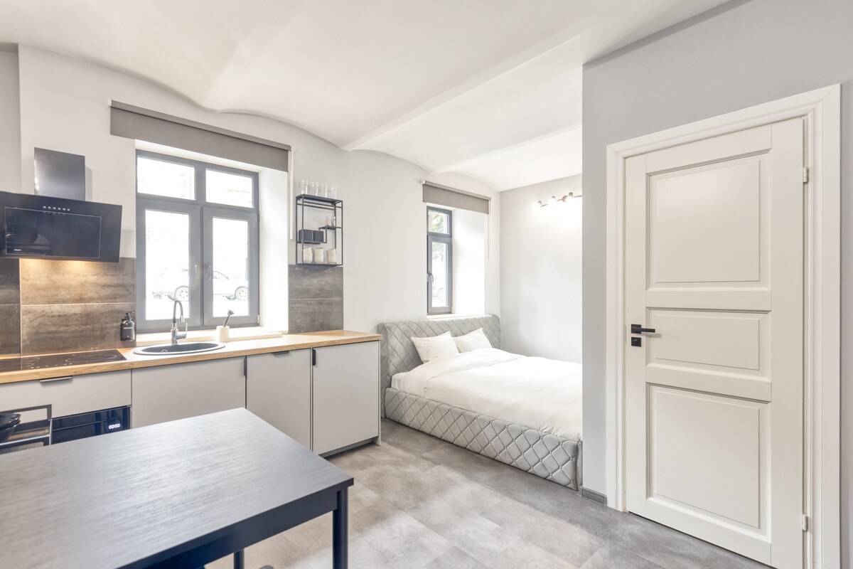 Fáilte chuig an árasán cluthar nua - aimseartha seo atá suite i gcroílár an ionaid stairiúil. Gheobhaidh tú ardán príobháideach iontach anseo, foirfe chun do chaife ar maidin a bhlaiseadh faoi sholas na gréine agus suaimhneas. Tá an t - árasán suite ar urlár na talún i bhfoirgneamh ciúin clóis, rud a chinntíonn sábháilteacht agus príobháideacht mar nach bhfuil rochtain ag aon strainséirí. Is féidir leat do charr a pháirceáil go slán sa chlós iata gan aon táille bhreise.