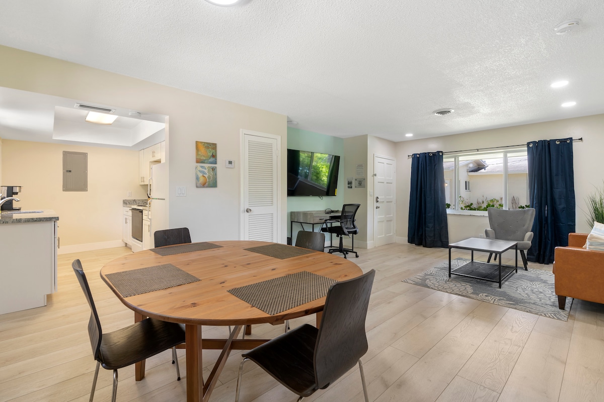 Bí iontach ag ár n - aonad álainn, atá suite nóiméad ar shiúl ó Hollywood Beach, Ciorcal Óg, páirceanna agus Aerfort Idirnáisiúnta Fort Lauderdale. 1 Seomra Leapa atá athchóirithe go hiomlán agus 1 Seomra Folctha le leaba ar mhéid an Rí, leaba do pháistí agus leaba thoilg Bhanríona sa seomra suí. Teilifís agus fearais chliste. Comhlánaigh earraí cócaireachta agus sceanra. Meaisín níocháin agus triomadóir cliste san áireamh. Glas tosaigh cliste, córas ceamara lasmuigh. 5G Wi - Fi ar fáil. Bain sult as an tsiamsaíocht oíche in aice le Ciorcal Óg agus síochántacht na dTránna sa cheantar.