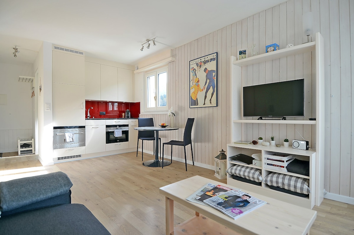 Tá árasán nua i seanbhallaí ag fanacht lena n - aíonna. Tá sé suite go díreach ar an Landwasser, tá an Rinerhornbahn agus stáisiún stad bus Davos Glaris/laistigh d'achar siúil 2 nóiméad. Tá an chistin nua - aimseartha comhtháite sa seomra suí. Críochnaíonn seomra leapa agus seomra folctha ar leith i ngorm an t - árasán. 2 sheomra - suíochán os comhair an árasáin - spás garáiste do charr, sciáil & rothar - cairdiúil do theaghlaigh - Davos Klosters Premiumcard san áireamh.