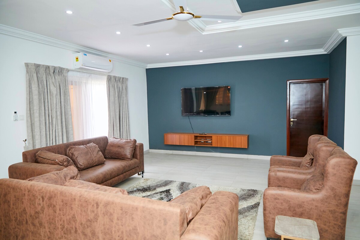 Fáilte chuig do theach as baile i bPobal Tema 3 - Airbnb saintógtha atá deartha le do chompord agus do shlándáil. Lonnaithe díreach 35 nóiméad sa charr ó Aerfort Idirnáisiúnta Kotoka, cuireann an réadmhaoin shuaimhneach seo timpeallacht shlán ar fáil le faireachas CCTV agus bainisteoir ar an láthair Buaicphointí: 3 Seomra Leapa En — suite - Tá leaba phluis bhanríona i ngach seomra 75"Teilifís Chliste sa limistéar suí Teilifíseáin 40"in dhá cheann de na seomraí codlata. Wi - Fi Feananna A/c & Uasteorainn Cistin Lánfheistithe Páirceáil saor in aisce