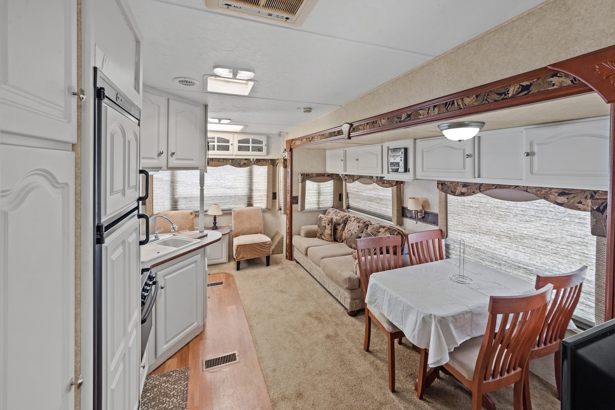 Go hálainn, compordach, Só Rv neadaithe ar fheirm chapaill álainn 5 acra díreach taobh amuigh de Atlanta agus 20 nóiméad ón Aerfort! Tar agus bain sult as an radharcra álainn agus féach ar na capaill ag súgradh! Tabhair faoi deara, le do thoil, NACH gcuimsíonn fanacht ag an bhfeirm marcaíocht ar na capaill nó ar an gcrúca RV. Cuirtear ceachtanna marcaíochta ar bun go heisiach trí Fhondúireacht Farms Atlanta. Tá RV lódáilte le cloigíní agus feadóga, cuirfear siúlóid 5 nóiméad tríd nuair a thiocfaidh tú san áireamh freisin chun cabhrú leat am a thabhairt ar cuairt go réidh agus compordach!