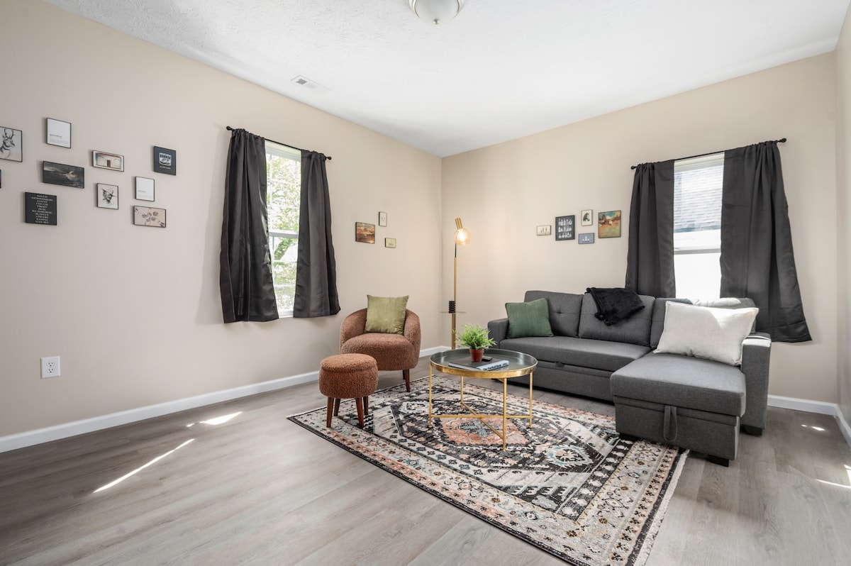 Fáilte chuig Casa de Cardinal! Neadaithe i gcroílár Muncie, cuireann an teach seo gach ceann de na sónna agus na luxuries a bhaineann le hárasán aon seomra leapa ar fáil. Cibé an bhfuil tú sa bhaile ar ghnó nó an bhfuil tú sa bhaile mór chun cuairt a thabhairt ar do theaghlach agus ar chairde, is tearmann gleoite suaimhneach é Casa de Cardinal chun tú a chur ar do shuaimhneas. Tá seomra suí ar leithligh, seomra leapa mór ina bhfuil 2 sheomra leapa lánmhéide, teallach, limistéar deisce, cistin lánfheistithe, seomra folctha ina bhfuil cithfholcadán seasaimh, agus seomra níocháin san árasán seo.