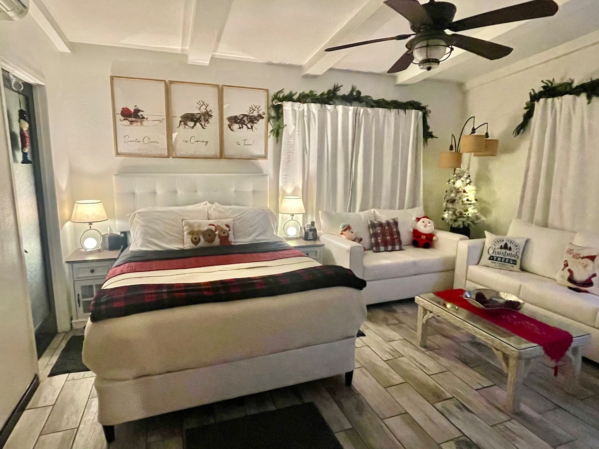 Spend Christmas @ The Cabin! Don’t come here if you don’t like Christmas! There is a Coco Station where you can make hot chocolate w/ mini marshmallows and peppermints. Apple cider and Popcorn packets too! There is a s’mores station to take out to the fire pit. Don’t forget, STARS, STARS! This little cabin sits next to a mountain, 3 miles from town on a little dirt road. You'll enjoy with wildlife all around. Ring security cameras on all exterior doors, kitchen door, back door and side door.
