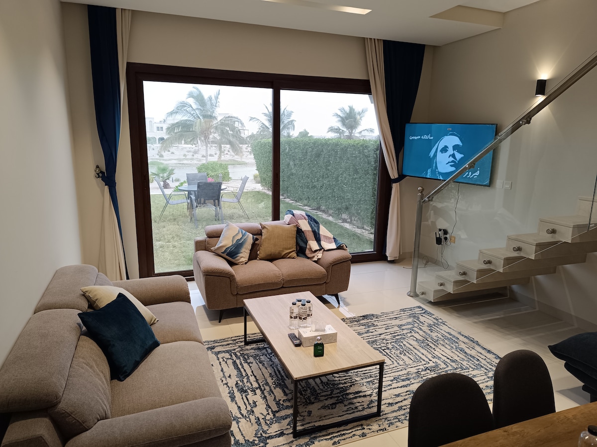 Téigh siar agus lig do scíth sa spás socair galánta galánta seo...Teach baile mór galánta nua - aimseartha ina bhfuil gairdín agus balcóin ag breathnú amach ar an laguna. Áit inar féidir leat taitneamh a bhaint as do bhéilí agus deochanna maidineacha agus tráthnónta in ionad saoire hawana gar do mhuiríne iontach Tránna pobal álainn agus éagsúlacht gníomhaíochtaí 🚤🪂🧘♀️spóirt🚴♀️🏊🎾 agus áiseanna. tá an suíomh in aice le go leor de na nithe is díol spéise do thurasóirí salalah ⛰️🛶🛕 fós eispéireas uathúil ar stíl mhaireachtála sómasach nua - aimseartha.