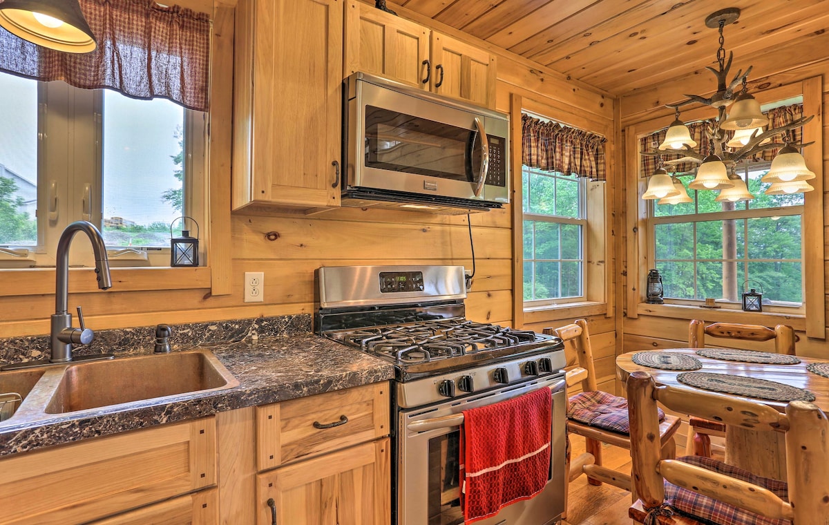 Socrú ciúin coillte le haghaidh cábán logála barántúil: *Limistéar coillteach féinchuimsitheach. Tá úinéirí ina gcónaí in aice láimhe. Tithe eile atá le feiceáil sa gheimhreadh. * Téann bóthar salachair tuaithe 1/2 mhíle thar thithe ar an mbealach chuig an gcábán. Tiomáin go mall, le do thoil! *Comharthaí feadh an bhóthair tar éis do GPS duilleoga as. * Casann an áit pháirceála timpeall. *Críochnaigh an seomra folctha *Cistin: oigheann comhiompair/ friochtán aeir/teaglama micreathonnach, Keurig, tóstaer, faoi fhrithfhrig ./ reoiteoir beag. *Leaba bhanríona lochta * Futon Dúbailte *Potaí, pannaí, uirlisí * Seirbhís tábla do 4 *Cluichí, leabhair