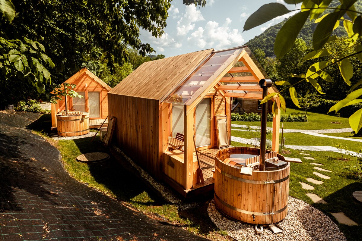 Bain sult as suaimhneas an dúlra inár dteach beag bídeach uathúil, díreach 20’ ó Bled. Bí i do chodladh le murmur na habhann ag dul thart, grianghortha ar ár n - ardán adhmaid ar bhruach na habhann agus téigh ag snámh sa tobán viking lasmuigh i ngach séasúr. Feistithe le haghaidh cócaireachta laistigh agus lasmuigh, tá ár dteach gleoite fáilteach do dhaoine beaga agus móra araon, lena n - áirítear sabhna modúlach, trá phríobháideach agus pictiúrlann lasmuigh!