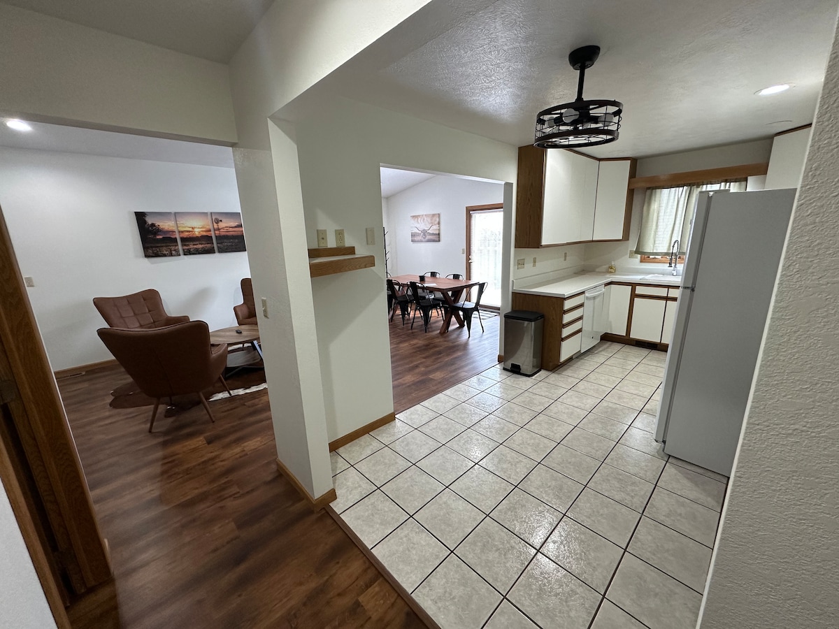 Tá an teach seo ar shiúl ón mbaile suite gar don pháirc, don ospidéal, Músaem Stairiúil Meade County, agus an Dalton Gang Hideout. Tá Fairgrounds Chontae Meade suite laistigh de thiomáint 5 nóiméad. Tá 2 sheomra leapa ar leith, 1 fholcadán, agus tolg fillte sa seomra suí sa teach seo ionas go gcodlóidh an réadmhaoin 6. Tá cistin mhór ina bhfuil caife/tae/Beár sneaiceanna suite laistigh de limistéar na cistine. Tá teilifíseán cliste ann atá lódáilte le GO LEOR feidhmchlár sruthaithe. Cleachtadh Rothar agus workout DVD'S.
