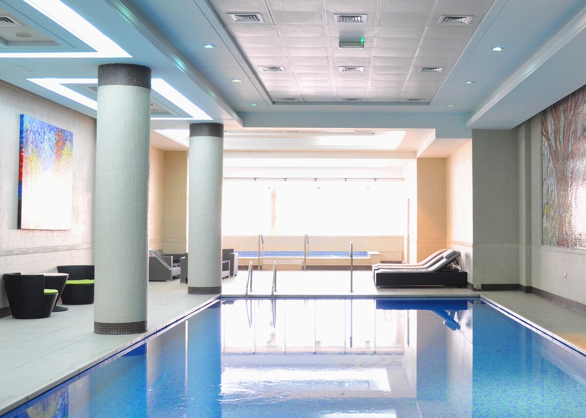 Bíodh compord agus stíl agat san árasán teolaí 1 sheomra leapa seo in Porto Arabia, The Pearl. Foirfe do bheirt, agus an rogha agat suas le ceathrar a chodladh ag baint úsáid as leapacha tolg compordacha. Lig do scíth san áit shuíocháin fáilteach le teilifíseán 52"agus rochtain ar 500+ cainéal. Bain sult as cistin iomlán, Wi - Fi saor in aisce, giomnáisiam, linnte snámha, áiseanna spá, seomra cluichí, agus seomra súgartha do pháistí. Páirceáil phríobháideach saor in aisce san áireamh. Céimeanna ó chaiféanna, siopaí agus radhairc muiríne, tá gach rud a theastaíonn uait le haghaidh fanacht speisialta Doha sa phríomhshuíomh seo.