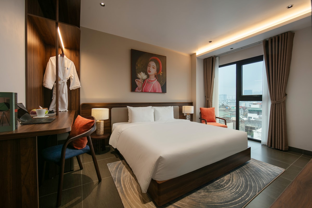 🌿 Deluxe 45m² – Balcony & Bathtub | Central Ha Noi 🏡 Details: Size: 45m², spacious and comfortable design Bed: 1 king-size bed (1.8m x 2m) with a soft mattress Bathroom: a bathtub and a standing shower, including 5 sets of towels and 5 sets of personal amenities Amenities: Refrigerator, electric kettle, TV with Netflix, safe box, free drink water, coffee, and tea Private Balcony: Airy with a beautiful view ✨ Included Services: Free breakfast Free swimming pool Free basement parking