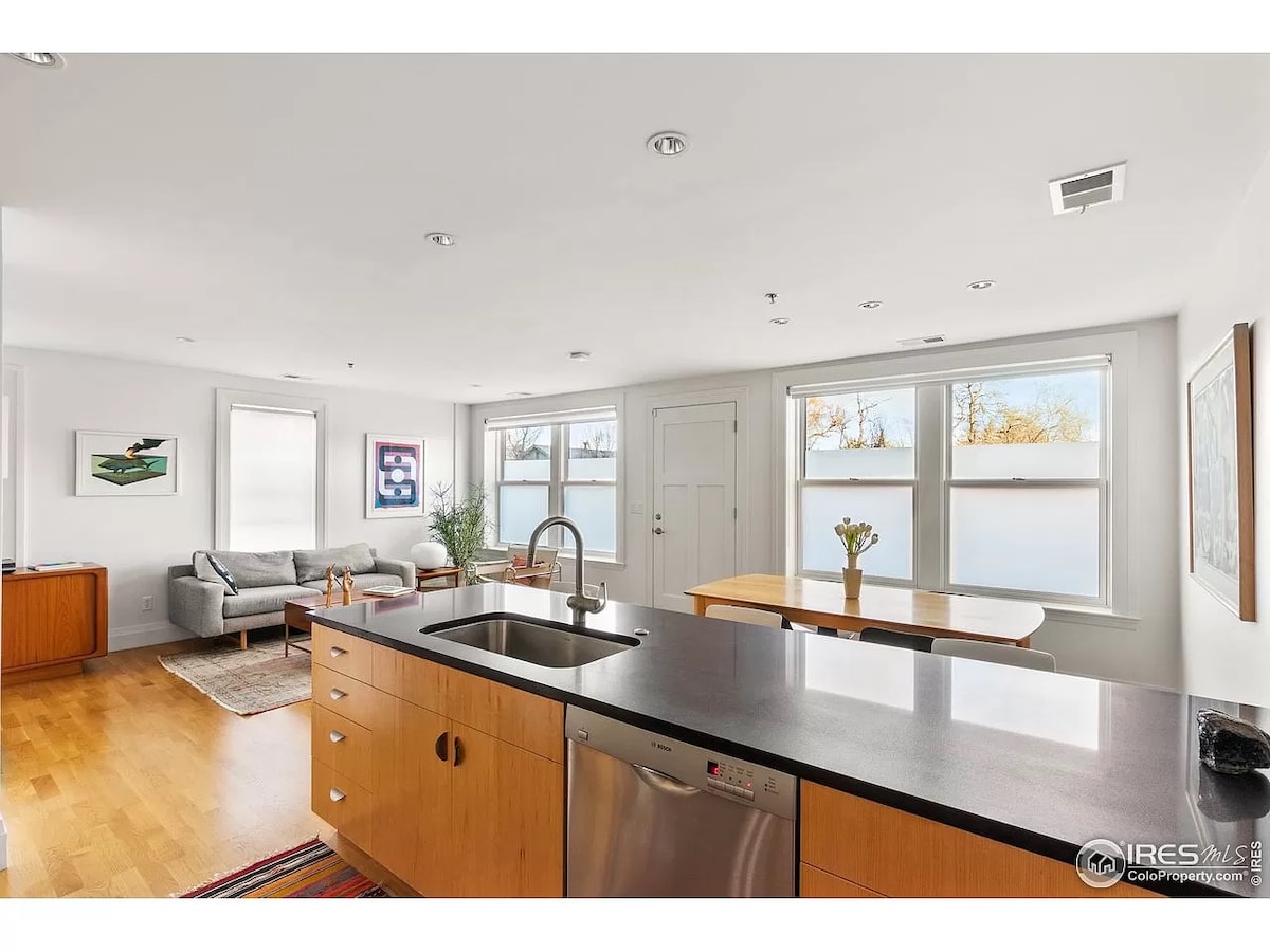 Bain sult as eispéireas coimeádta ag an árasán nua - aimseartha seo i stíl teachín nua - aimseartha. Urláir seomra folctha téite, braillíní línéadaigh íon, cuntair gallúnaí, ealaín bhunaidh - bhí an spás seo deartha go neamhbhalbh chun go mbeidh tú teolaí agus ardaithe. Cuireann sé saoráidí ar fáil ó mhaidin Nespresso go róbaí folctha pluise chun do scíth a ligean ag deireadh an lae. Suite go lárnach, is féidir ár suíomh a shiúl go dtí gach rud Boulder - CU Campus, Boulder Creek, Central Park, Farmers Market, Pearl Street, agus na bialanna is fearr i lár an bhaile.