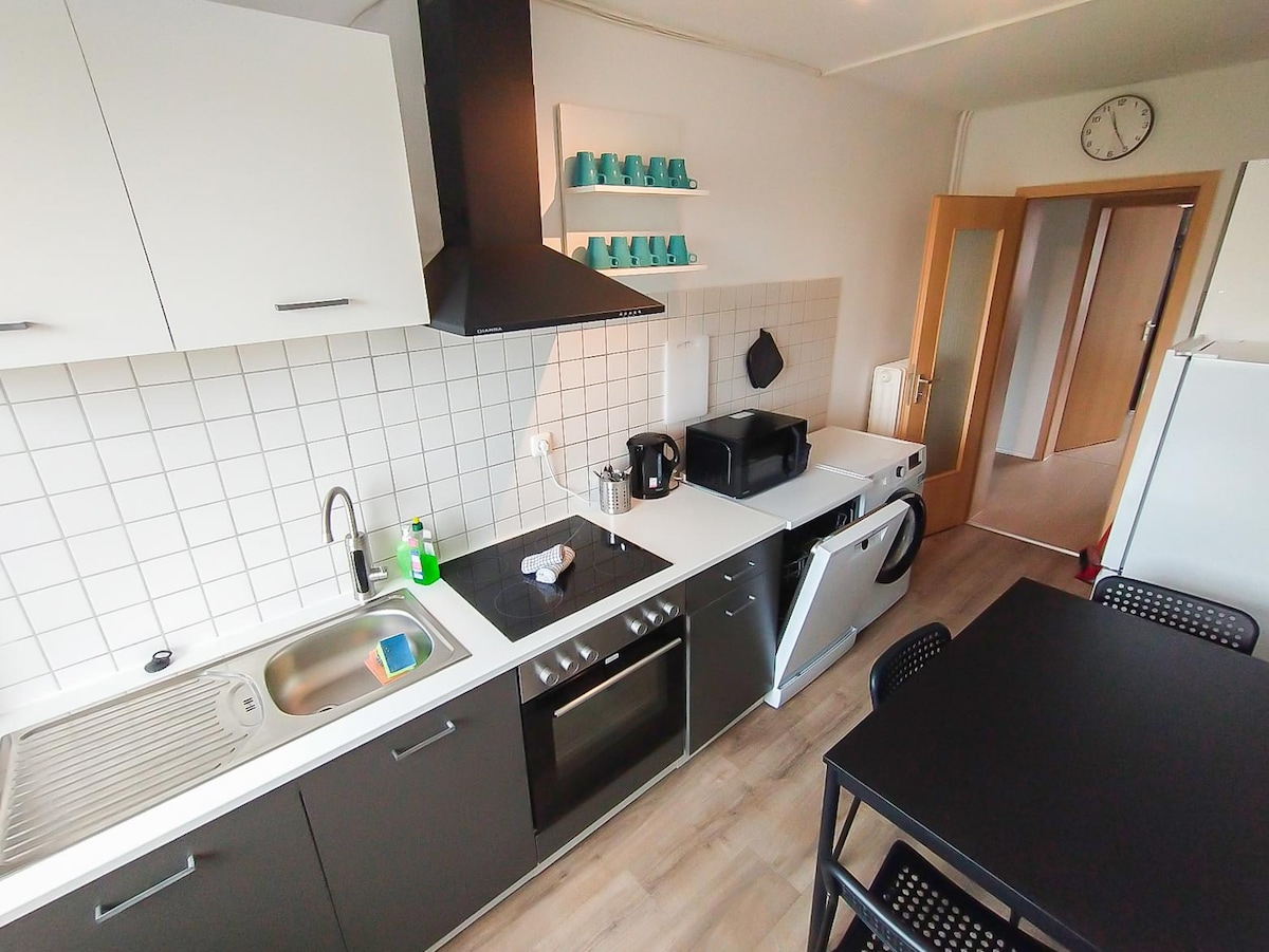 Árasán álainn 65 m² i gcroílár Duisburg ina bhfuil balcóin mhór 🏖️ (áit suí agus Strandkorb san áireamh) agus naisc fhoirfe le Stáisiún Lárnach Duisburg, Düsseldorf agus Messe Düsseldorf 🚆 Buaicphointí: Stad U -/ tram (Platanenhof) 200 m (U79/903) 🚋 Lárnach ach ciúin 🌳 Téamh faoi urlár 🔥 Cistin lánfheistithe 🍽️ Spás oifige tí 💻 Cithfholcadán báistí 🚿 Beár sa seomra 🍷 Teilifís Chliste le Netflix 📺 Foirfe do thurais chathrach nó do thréimhsí fanachta gnó ✨ Stáisiún mearluchtaithe do ghluaisteáin leictreacha díreach ar an tsráid ⚡🚗