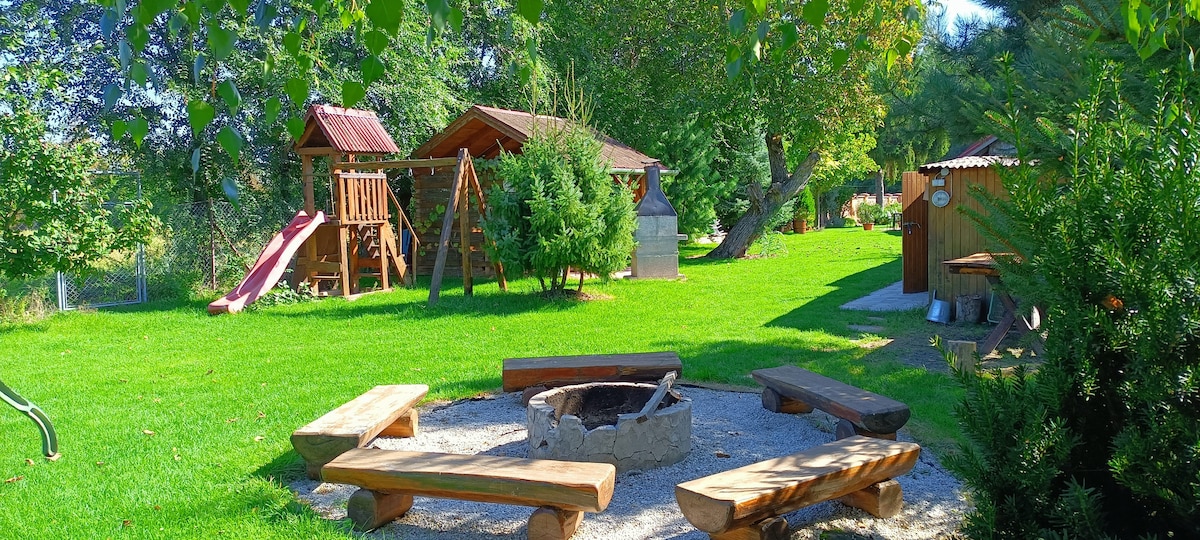 Caith do laethanta saoire i dteach draíochtúil ar imeall na cathrach, in áit chiúin, cois na foraoise, “i bhfad ón slua callánach .” Tá m'áit oiriúnach do theaghlaigh, ach do chairde freisin. Soláthraíonn an limistéar iata príobháideacht iomlán. Tairgeann dhá ardán áit shuíocháin thaitneamhach. Tá scáth fearthainne, gríoscán, áit suí sa phaitió lasmuigh. Is féidir leat an paitió laistigh a úsáid i ndrochaimsir freisin. Tá páirceáil ar fáil taobh thiar den gheata, chomh maith le os comhair an tí. Tá an teach feistithe go hiomlán agus go compordach. Tá linn snámha theirmeach 1.8 km (siúlóid 20 nóiméad).