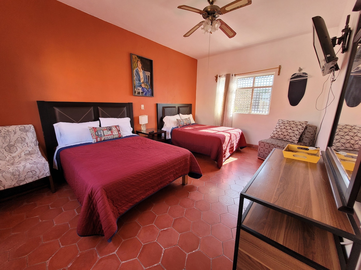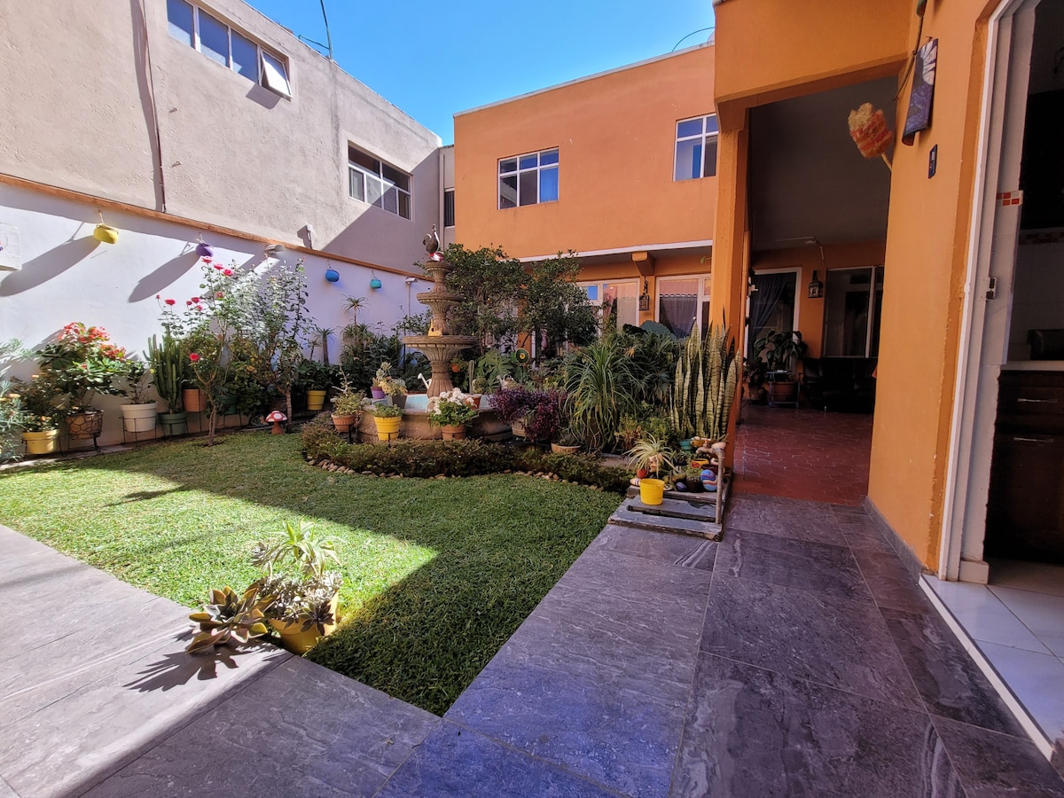 Iarscríbhinn árasán 🏠 iomlán chuig teach ina bhfuil cónaí air. Tá dhá sheomra leapa ann, seomra folctha amháin le gach saoráid, téitheoir gréine agus gáis, teilifíseán cliste, Wi - Fi, cistinéad iomlán, meaisín níocháin agus garáiste clúdaithe comhroinnte le doras leictreach. Codlaíonn 1 - 4 duine. Suíomh den scoth; ospidéal 5 nóiméad, trucail lárnach agus cearnóg tráchtála 10 nóiméad, ionad stairiúil 20 nóiméad, Oxxo, cógaslann agus iompar poiblí bloc amháin ar shiúl. 💯% TIMPEALLACHT AITHNIDIÚIL. Ceantar ciúin mór le rá atá ar fheabhas don chuid eile.