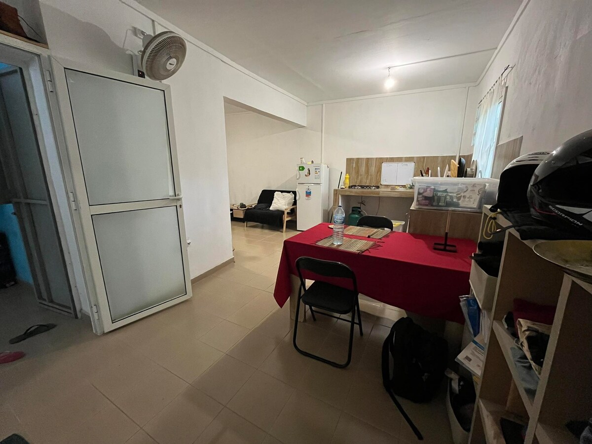 Cuirim stiúideo beag ar fáil do dhaoine atá ag dul tríd ar thalamh beag chun eitilt nó ag fanacht le do shonas a aimsiú sa chathair. Tá an áit go hiontach do dhuine singil amháin nó do lánúin amháin Tá na gnéithe seo a leanas ann: - 1 leaba dhúbailte - 1 chistin bheag + soithí - 1 seomra folctha ina bhfuil cithfholcadán + leithreas - Meaisín níocháin lasmuigh - 1 spás páirceála slán do 2 roth agus do charranna