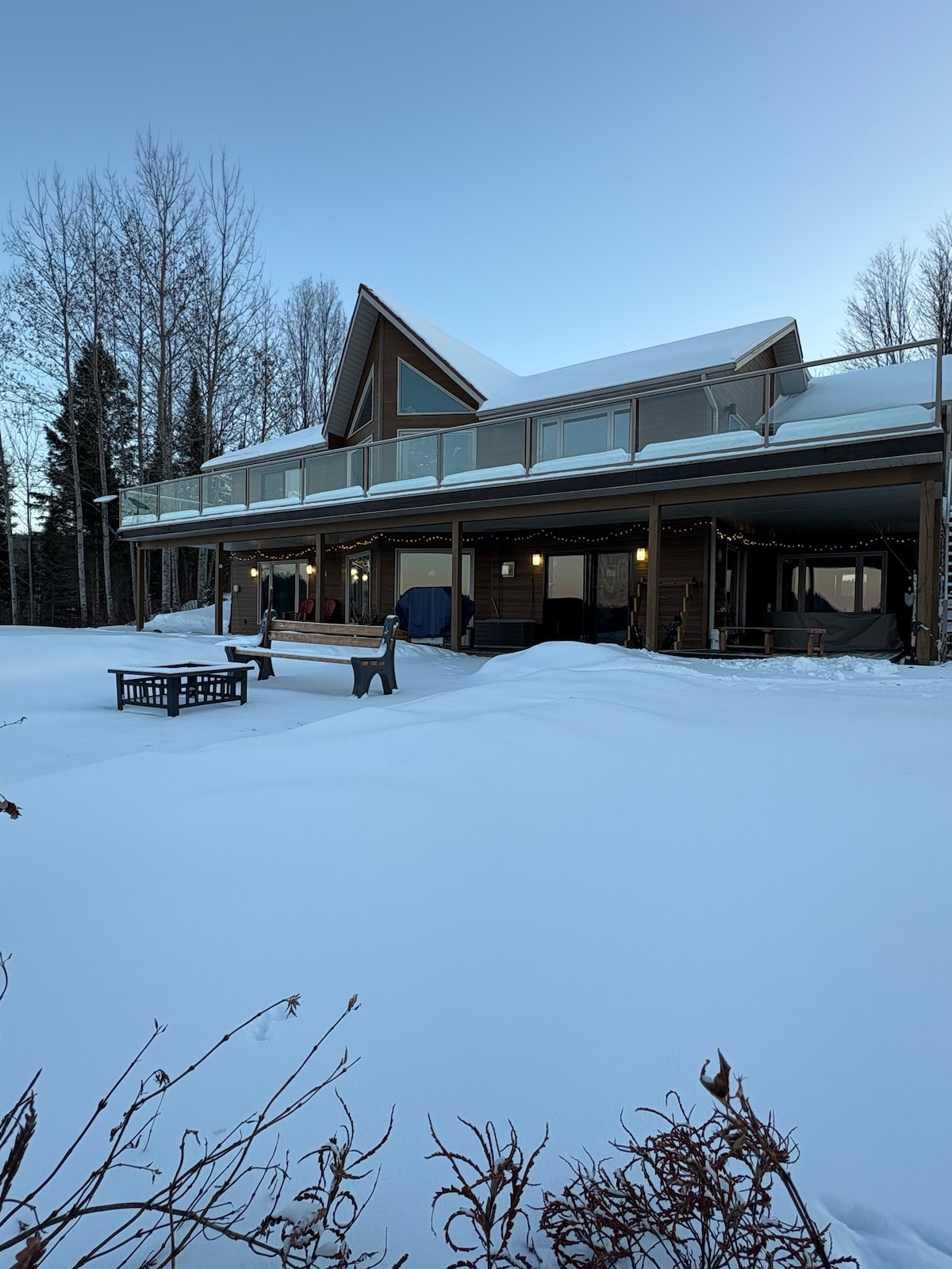 Deic → phríobháideach/mhór le beárbaiciú própáin + suíocháin (clúdaithe i rith an tsamhraidh) → Feistithe go hiomlán + cistin stocáilte Comharsanacht → thar a bheith sábháilte → San áireamh: canú, cadhc, bád céaslóireachta, snowshoes, seaicéid tarrthála → Treoirleabhar ina bhfuil liosta de na gníomhaíochtaí a chuirtear ar fáil nuair a dhéantar áirithint → Teallach/Woodstove seomra suí→ atá os comhair an Oirthir (solas na maidine) → Duga príobháideach chuig an loch Cuireadh→ fáilte roimh pheataí!