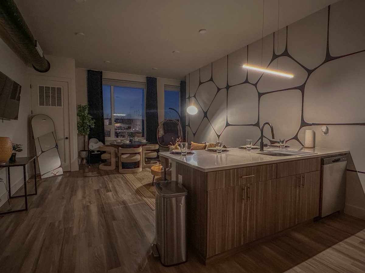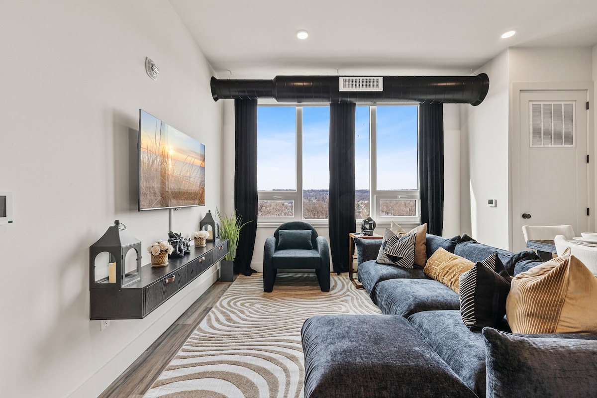Téigh isteach san árasán geal seo, áit a gcruthaíonn dathanna dearga boga agus dathanna neodracha teo tearmann cluthar. Téigh go NYC i 30 nóiméad, nó tiomáin 15 nóiméad go dtí an Prudential Center le haghaidh imeachtaí. Beidh tú ag teacht ón Aerfort i gceann 15 nóiméad, agus ní bheidh ort ach siúl 8 nóiméad go dtí an traein. Téigh go dtí American Dream i 15 nóiméad. 🏋️♂️Giomnáisiam 24/7 🚘 Páirceáil saor in aisce Radhairc 🌇 na Cathrach Rochtain ar 🛗 Ardaitheoir 🛏 Leaba Rí+ 2 Leaba Shingil Cistin 🍳 Lánfheistithe 🍽 Bia do 5 dhuine 📺 Teilifíseáin Chliste i ngach Seomra 🛜Wi - Fi tapa 🪑 Deasc Oibre 🧺 Meaisín níocháin/triomadóir 🔥 Teas Lárnach & Aerchóiriú