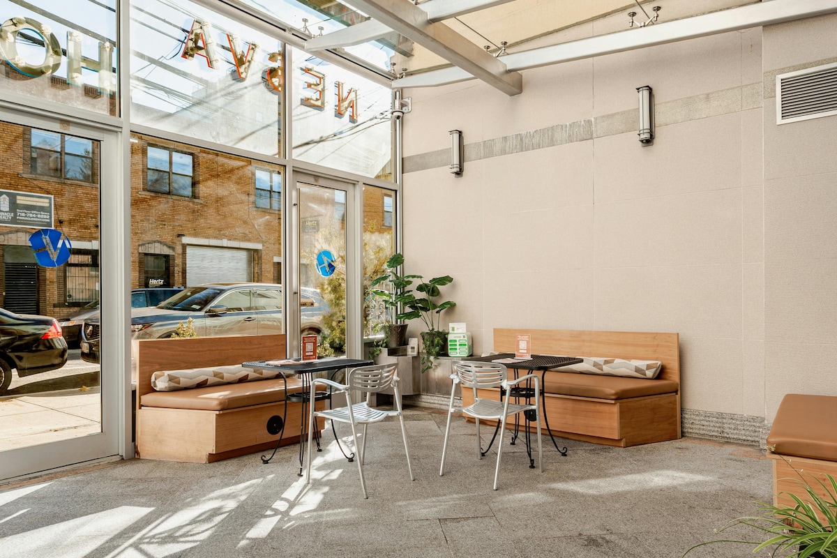 Téigh isteach i dtearmann Zen síochánta i gcroílár NYC. Tá leaba iomlán cúr cuimhne, deasc, vardrús, doirteal príobháideach agus fuinneog faoi sholas na gréine sa seomra teolaí seo. Bain sult as plandaí, solas nádúrtha, agus snáithíní suaimhneacha. Tá seomra folctha an halla chomhroinnte príobháideach agus coinnítear gan smál é. Tá rochtain ag aíonna freisin ar chúlchlós ciúin Zen, áit itheacháin, uisce scagtha, caife, agus earraí bricfeasta saor in aisce an lá ar fad. Tá madraí seirbhíse ceart go leor le doiciméid chearta!