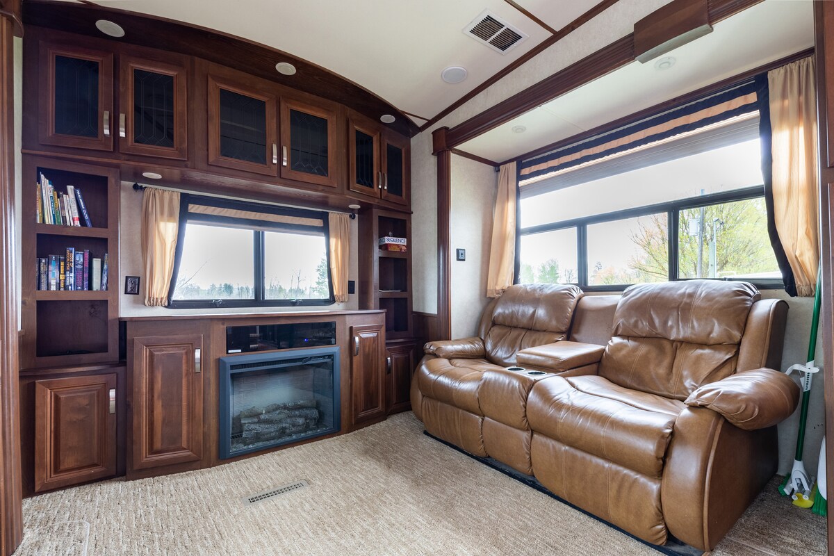 2013 40' 5th Wheel I riocht den scoth agus le cuma nua - aimseartha agus daingneáin. Scáileán mór teilifíse thíos staighre agus teilifís sa Seomra Leapa. Meaisín níocháin/Triomadóir taobh istigh de RV Tarraing amach leaba dhúbailte Sraith recliner leathair View of Cornucopia Peak agus achar siúil go dtí an baile