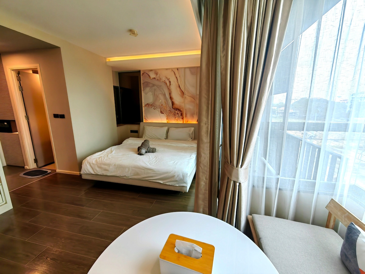 Fáilte go dtí mo ósais Pattaya! D'iompaigh mé seomra milis óstáin ina Airbnb foirfe do gach cineál taistealaí. Tá áit chónaithe oscailte san árasán fairsing seo atá spreagtha ag an tSeapáin agus a bhfuil leaba thoilg chompordach ann, solas na gréine flúirseach, cistin lánfheistithe, meaisín níocháin, seomra folctha chic, agus sabhna príobháideach (!). Faigh suaimhneas ar dhá bhalcóin Zen. Is tearmann é an seomra leapa ina bhfuil leaba rímhéide, deasc, teilgeoir, cainteoirí Bose, agus uBox chun breathnú ar scannáin gan teorainn. Coigeartaíonn soilsiú cosúil le scamall le do ghiúmar