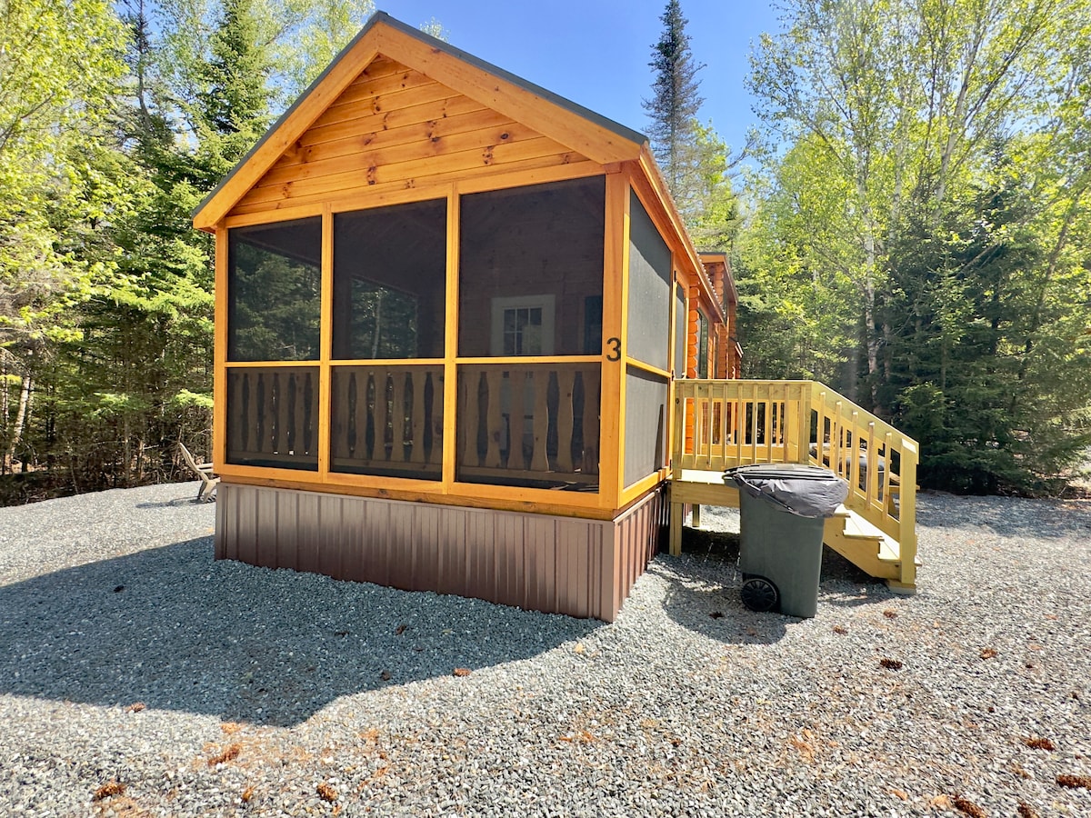 Tógtha in 2023, tá ár gcábán suite ar shliabh cúlráideach in East Machias, Maine. Tá radhairc dhochreidte ar an gcábán beag seo d'Abhainn na Machias Thoir ón bpóirse tosaigh. Tugaimid cuireadh duit fanacht agus taitneamh a bhaint as fuaimeanna na n - éan dúchasach agus féachaint ar na hiolair os a chionn, na fianna frolic trí na crainn, agus turcaithe fiáine a bhfuil cónaí orthu sa limistéar coillteach seo. Tá an cábán tógtha de lumber meilte ónár réadmhaoin. Codlaíonn ár gcábán teolaí 4 dhuine fásta go compordach ach is féidir leis suas le 5 dhuine san iomlán a chodladh le rogha futon.
