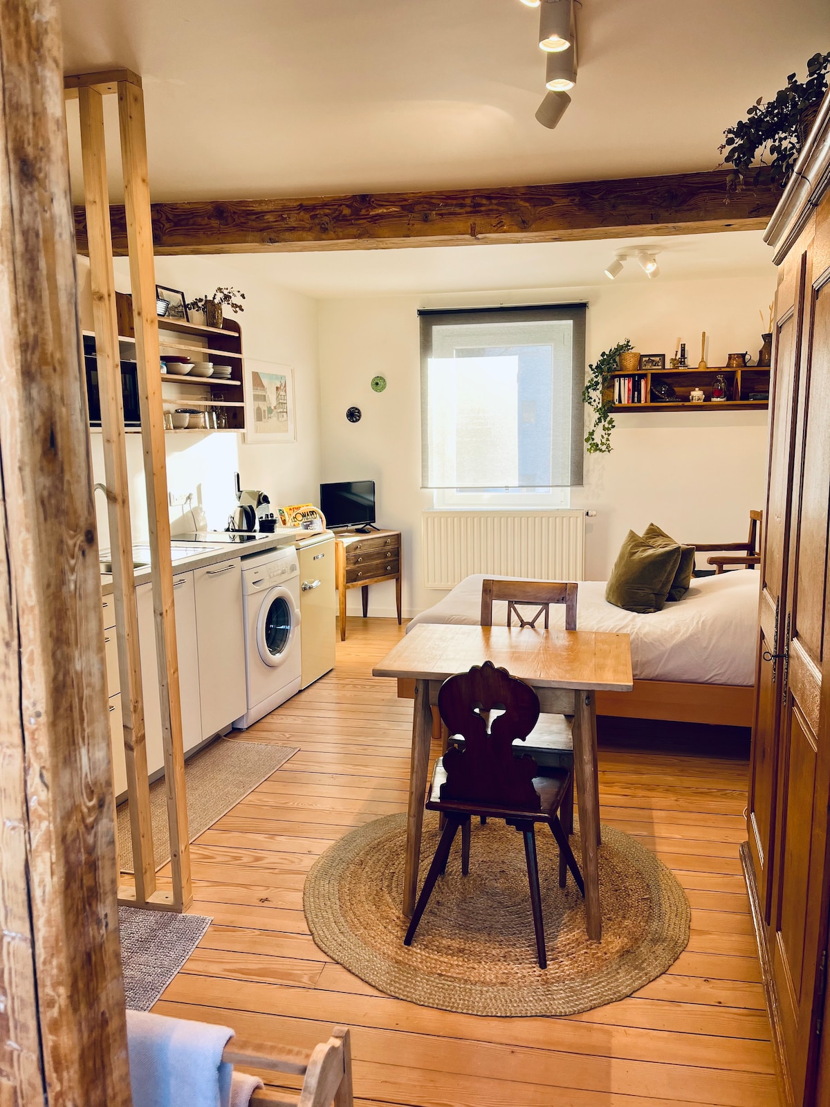 Tá an stiúideo neamhspleách suite i gclós ár dteach, tá sé geal, ciúin agus i dtimpeallacht ina bhfuil an dúlra le feiceáil: gairdín, éin, agus é gar do lár na cathrach. Sa samhradh is féidir leat taitneamh a bhaint as an ngairdín. Tá leaba dhúbailte sa phríomhsheomra (160 x 190) agus leaba futon (140 x 200) do bheirt (leanaí ar an meaisín más féidir) Tá Cearnóg na hArdeaglaise 8 nóiméad ar shiúl sa charr. Rochtain éasca ar Strasbourg trí iompar poiblí.