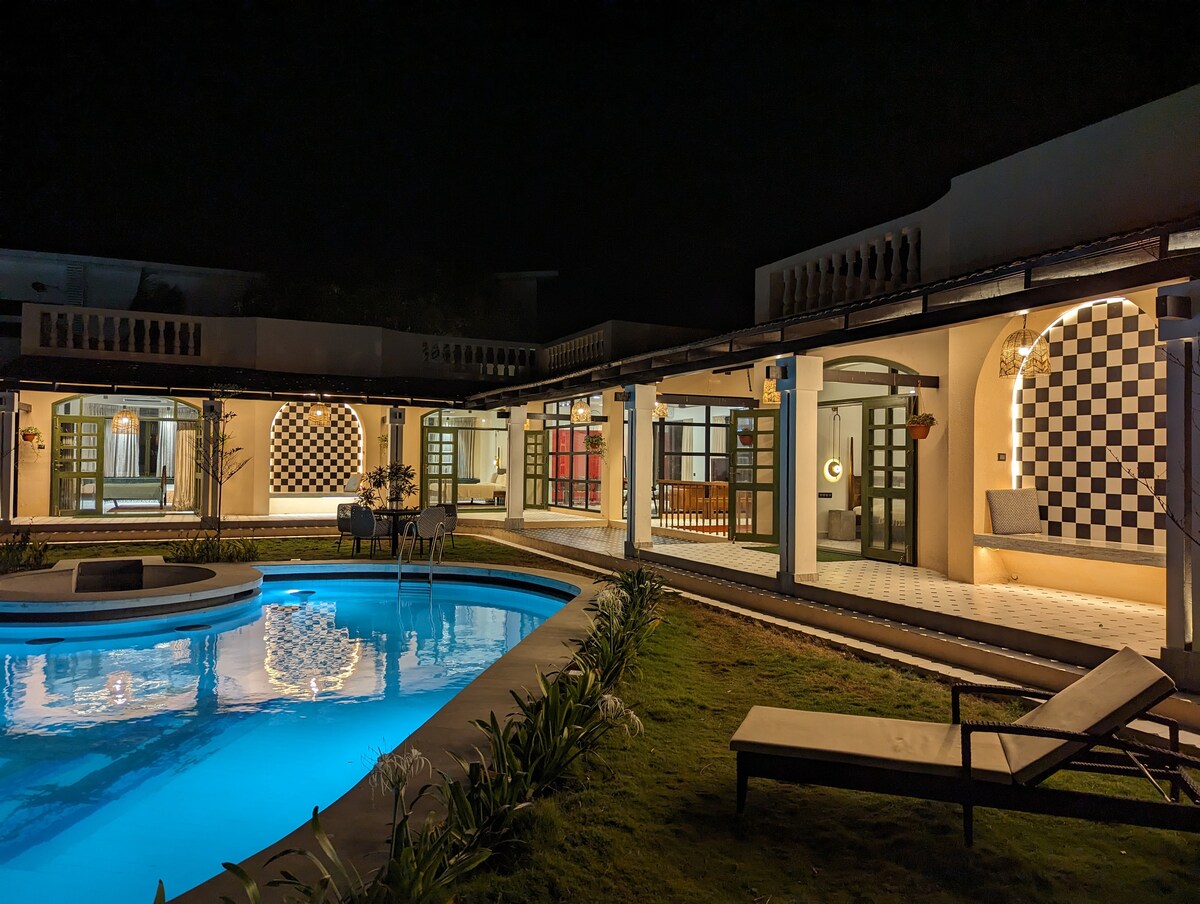 Welcome to our spacious 4BHK retreat! Enjoy a comfortable stay with 1 AC room on the ground floor and 3 AC rooms on the first floor,accommodating up to 30 guests. With 6 bathrooms with heaters, a big hall for events,and a fully equipped kitchen. Dive into our adult pool (3-5 to 5.5ft) the kids' pool (2ft), and take advantage of our large lawn with seating. Enjoy indoor and outdoor games, a BBQ setup, and the option for an in-house cook. With 24/7 power backup,Wi-Fi, and Ample parking,