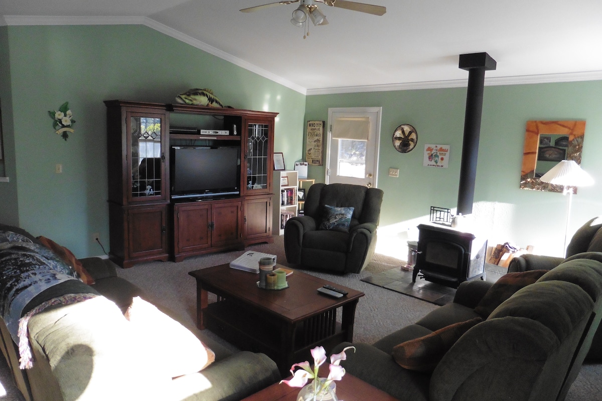 Suite san fhoraois, cuireann an teach nua álainn 1 seomra leapa seo áit shíochánta, shábháilte agus shuaimhneach ar fáil le fanacht agus le do scíth a ligean. Mothóidh tú go bhfuil tú i do dhomhan féin, ach ar bhaile Mt. Níl Shasta ach 3 mhíle ar shiúl. Tá sé suite go háisiúil freisin gar do Loch Siskiyou agus ionad saoire sciála Mount Shasta. Tá cosáin fánaíochta agus rothaíochta in aice láimhe. Cibé acu nach dteastaíonn uait ach do scíth a ligean, agus/nó dul amach agus ceantar álainn Mount Shasta a fheiceáil, is áit iontach é an Pine Siúcra!