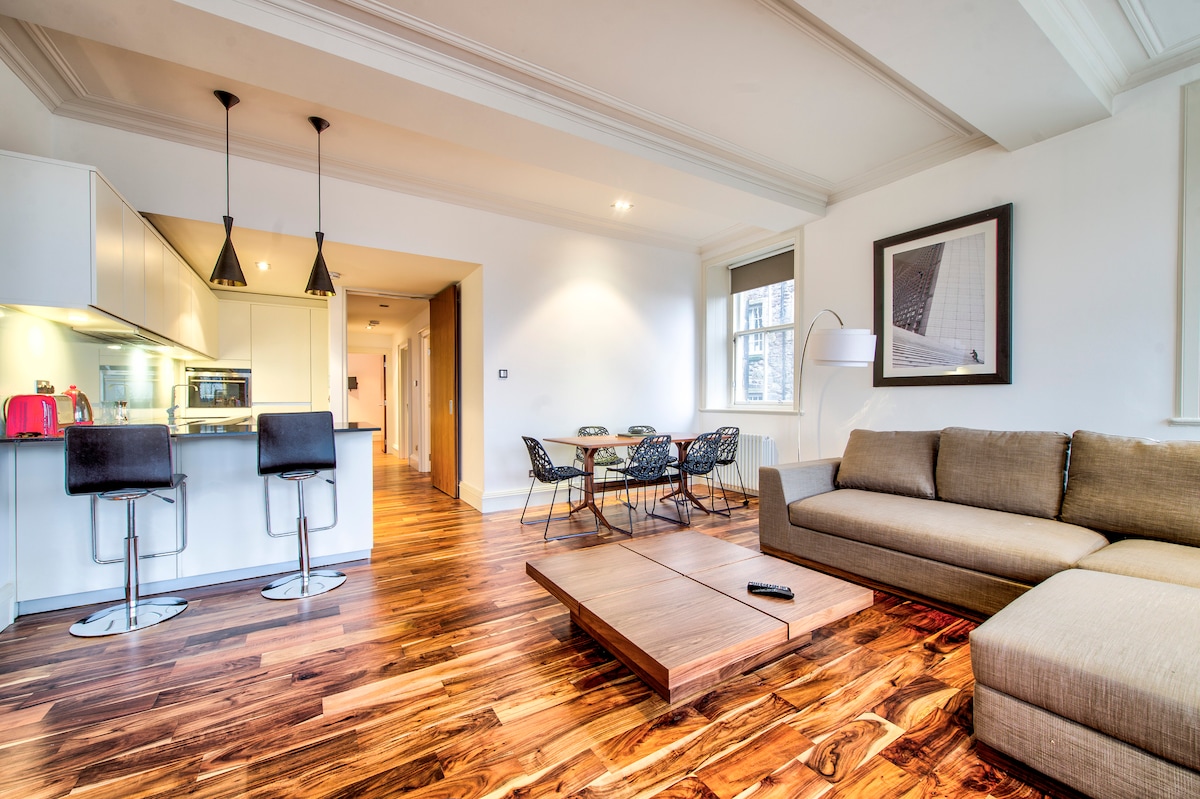 Suite go foirfe ar imeall Iarthar an Bhaile Nua, níl ach cúig nóiméad siúil go Sráid an Bhanphrionsa agus Sráid Sheoirse ach le radhairc áille oscailte ar na gairdíní príobháideacha ar Uisce an Leith agus Droichead na Rinne go Droichead an Stoic ón seomra suí agus ón dara seomra leapa. Athchóiríodh Seoirseach le déanaí, cothrom Urlár na Talún, críochnaithe go galánta le síleálacha arda agus gnéithe traidisiúnta ach tá leagan amach plean oscailte funky, dhá sheomra leapa agus dhá sheomra folctha ann.