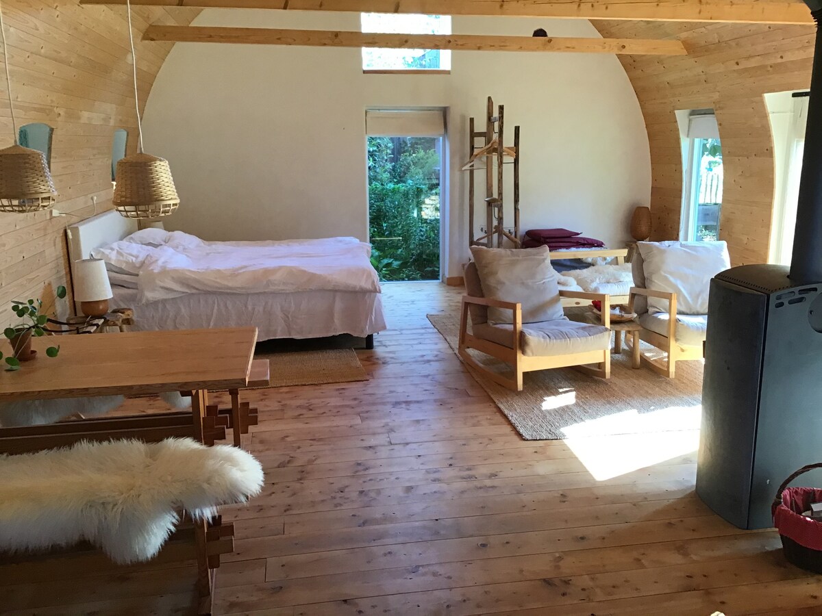 Scaoil leis an éalú suaimhneach cúlráideach seo. Cuireann ár dTeach Cruach, atá ardaithe ar stilts, príobháideacht agus nasc neamhchoitianta leis an dúlra ar fáil. Lig do scíth sa sabhna le haghaidh tearmainn shíochánta. Ag an bpointe is airde os cionn an uisce, coinníonn áit suí ina bhfuil sorn adhmaid 360º teolaí thú. Bain sult as oícheanta scannáin le beamer agus cainteoir le haghaidh siamsaíochta breise. Lasmuigh, tá deic mhór adhmaid le tolglann gréine, bord bia lasmuigh, beárbaiciú, oigheann píotsa, agus radharc iontach ar an loch ag fanacht. D'úinéirí madraí: tá fál timpeall na réadmhaoine😊