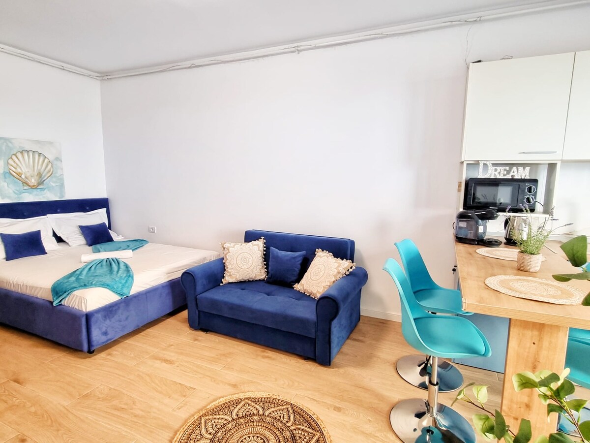 Tá an Péarla Gorm seo suite in áit chiúin Eforie Nord( South Side) Tá 10 nóiméad agat ag siúl go dtí an trá is gaire (Roxi Beach) agus tá na tránna is áille le huisce turcaoise sa chuid theas. Ar feadh 2 nóiméad ag siúl gheobhaidh tú Ollmhargadh Lidl ar an taobh clé agus ar thaobh na láimhe deise is é an Stáisiún Traenach é! 5 nóiméad ag siúl go dtí an pháirc , 10 nóiméad ag siúl go dtí an tIonad !