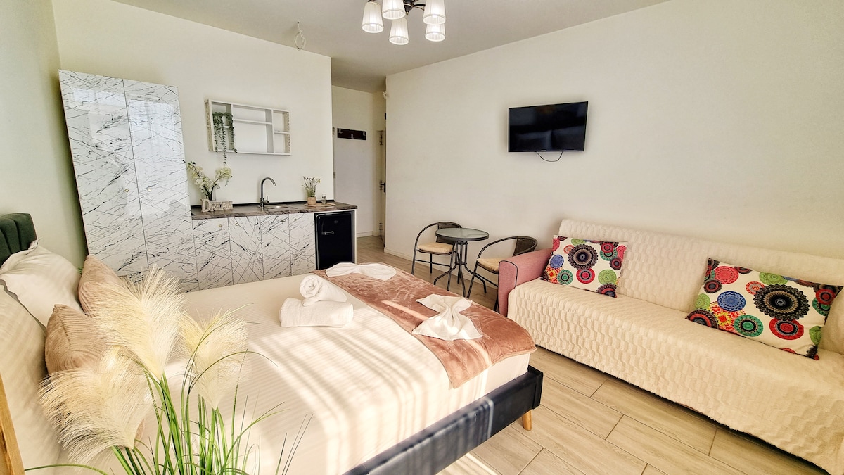 Relaxează-te într-un Superior Apartment din Atmosphere by the Sea, ideal pentru un sejur confortabil la mare. Apartamentul include living, dormitor, balcon și baie cu duș walk-in. Dotat cu aer condiționat cu purificare, Smart TV (Netflix, HBO, Disney+, YouTube), internet, pat matrimonial și canapea extensibilă. Capacitate maximă: 4 persoane. Lenjeria și prosoapele sunt incluse. 🌊✨