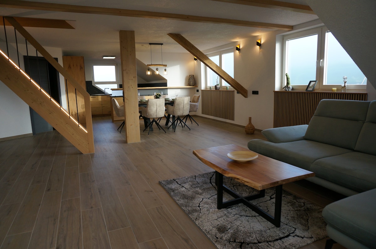 Tá árasán úrnua, nua - aimseartha, ardchaighdeáin agus feistithe go grámhar romhat, rud a fhágfaidh go mbeidh d'fhanacht ina bhuaicphointe. Os comhair an deiscirt, suite ar imeall ciúin an tsráidbhaile agus an mhóinéir, le radhairc lánléargais iontacha ó éirí go luí na gréine. Le balcóin agus leithreas ar leith. Maidir leis an 5ú agus an 6ú duine, is féidir an tríú seomra leapa "Dachstüble" a chur in áirithe sa bhreis do gach ceann de € 15 in aghaidh an P ./ N. Tá sé inrochtana ag an staighre ar an taobh istigh.