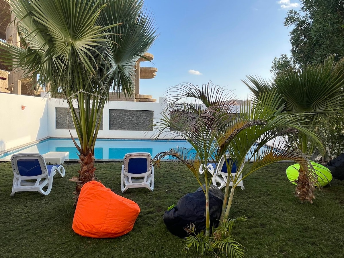 Bíonn ár bhfáilteachas foirfe i gcónaí, cinntímid i gcónaí go mbainfidh gach duine taitneamh as a fhanacht nó a fanacht ag ár n - óstán. Níl ár n - óstán ach 10 nóiméad ar shiúl ón ionad, tá gach rud a úsáidtear san fhoirgneamh 100% ón dúlra. Fuaireamar 6 sheomra leapa agus tá a seomra folctha féin ag gach ceann acu, fuaireamar seomraí singil, dúbailte , triarach & Quadro. Fuaireamar áit phaitió speisialta, áit dheas dóiteáin. Chomh maith leis sin tá díon álainn do radharc ardú na gréine. bricfeasta san áireamh cheana féin. Fuaireamar cistin chomhroinnte lánfheistithe freisin. Beimid ag fanacht leat❤️