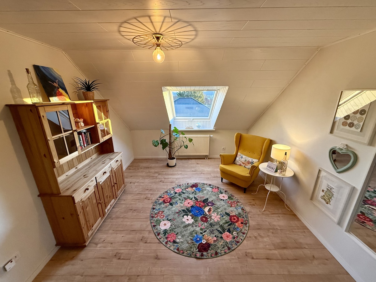 Is teaghlach óg muid agus cuirimid árasán ar fáil duit atá feistithe go grámhar i gceantar Kassel – deartha de réir an mhana "Maidir liomsa". Tá lochtán thart ar 20 m², atá clúdaithe go páirteach, agus gairdín san árasán. Níl aon rud in easnamh ón bhfeistiú: idir spíosraí agus chluichí boird agus mheaisíní níocháin, idir scáthláin agus tháirgí cúraim. Tá cathair Documenta Kassel suite go ciúin thart ar 15 nóiméad ar shiúl.
