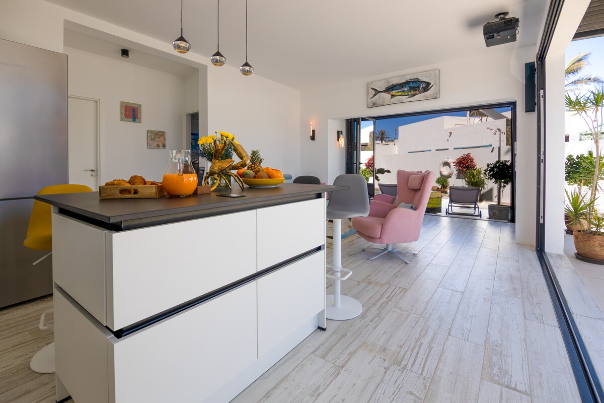 Árasán go heisiach do lánúineacha ag a bhfuil radharc na farraige, WI - FI, in aice le tránna agus i lár Corralejo. Suite le seomra leapa fairsing le leaba rí - mhéid agus Android TV lcd 32" Radharcanna iontacha ar an dá thaobh, fiú ón leaba, trí fhuinneoga fairsinge, agus iad in ann na bolcáin agus na tránna a fheiceáil. Cistin lánfheistithe San áireamh i ngach fanacht: Tuáillí: 2 thuáille cithfholcadáin + 1 tuáille doirtil in aghaidh an duine Bileoga: 1 sraith braillíní ar feadh seachtaine amháin agus 2 shraith ar feadh níos mó ná seachtain Páipéar leithris: 2 rolla in aghaidh an tseomra folctha