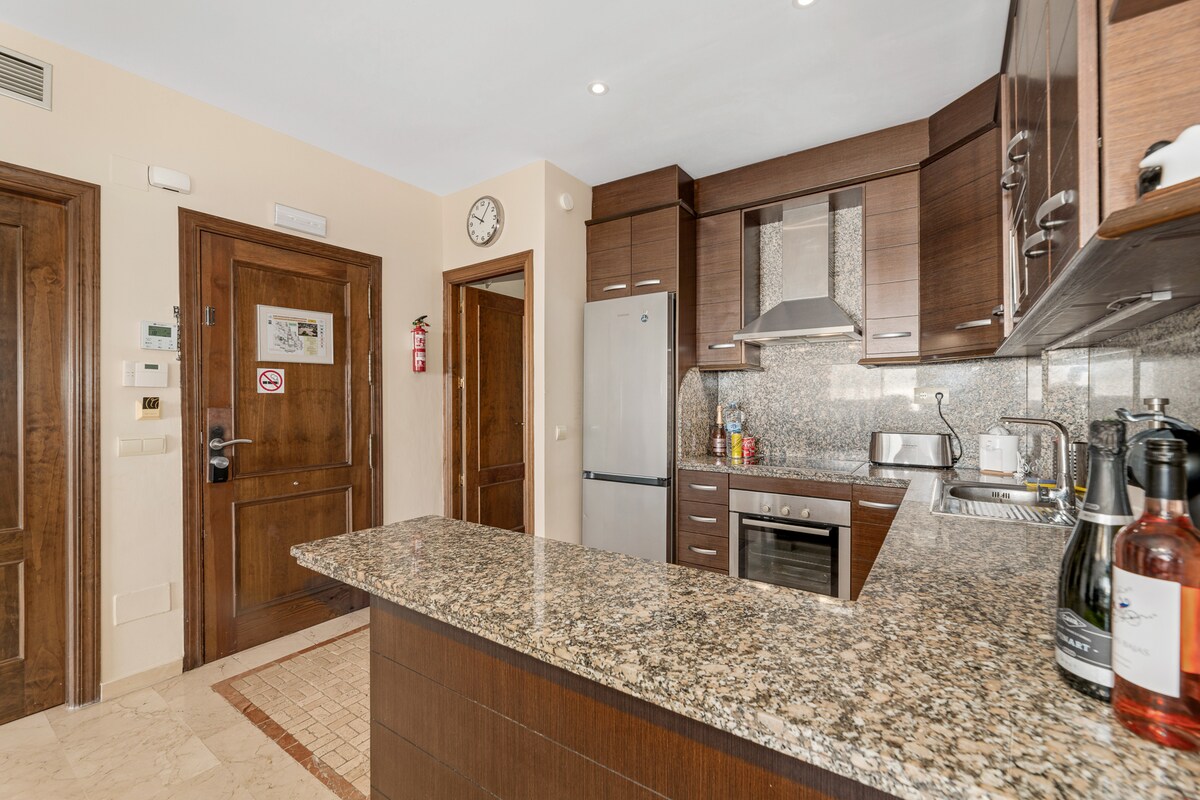 Bíonn an linn snámha laistigh (teasa) ar oscailt i rith an gheimhridh. Linn snámha lasmuigh ar oscailt ó cheann ceann na bliana. Árasán nua - aimseartha le radharc farraige agus linn snámha ón ardán mór. Galánta le dhá sheomra leapa agus dhá sheomra folctha, ceann en suite. Tá con aeir lárnach i ngach seomra. Sa chistin lánfheistithe fuair tú oileán cistine agus áit itheacháin. Teilifís scáileán comhréidh. Wi - Fi saor in aisce. Níl ach 2 km go dtí an trá Tá páirceáil sa gharáiste san áireamh. Tá an t - árasán foirfe do sheisear aíonna. Tá áiteanna linn snámha, seomra allais (táille) agus ionad aclaíochta agat. Cúrsaí gailf in aice láimhe.