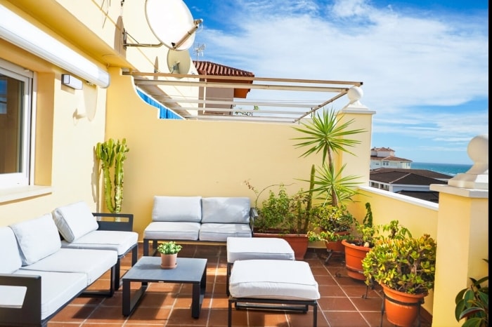 Fáilte go Penthouse Marinsa Beach, penthouse stylish agus luxuriously troscán ar an Costa del Sol grianmhar. Cuireann an teach saoire uathúil seo gach rud ar fáil le haghaidh fanacht suaimhneach dodhearmadta: ardán mór príobháideach ar an díon ina bhfuil radharc na farraige, saoráidí ardleibhéil, agus suíomh foirfe nach bhfuil ach siúlóid ghearr ón bhfarraige, ón trá agus ón bpromanáid.