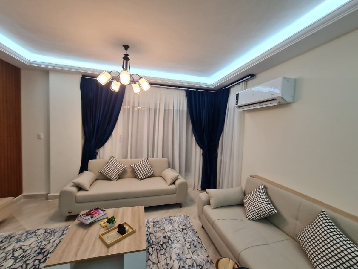 Fáilte chuig do shaoire fhoirfe! Tá 2 sheomra leapa agus áit fáiltithe chic san árasán galánta seo, rud a fhágann go bhfuil sé oiriúnach do theaghlaigh nó do ghrúpaí cairde. Fan fionnuar agus compordach le haerchóiriú, foirfe do laethanta te an tsamhraidh. Cruthaíonn an maisiúchán faiseanta agus an vibe teolaí atmaisféar fáilteach a bhraitheann díreach cosúil leis an mbaile. Tá an t - árasán galánta agus néata, ag tairiscint atmaisféar suaimhneach agus úrnua. 5 nóiméad ó Rehab Mall, An Margadh, agus An Chúirt Bia *15 nóiméad ón Aerfort*