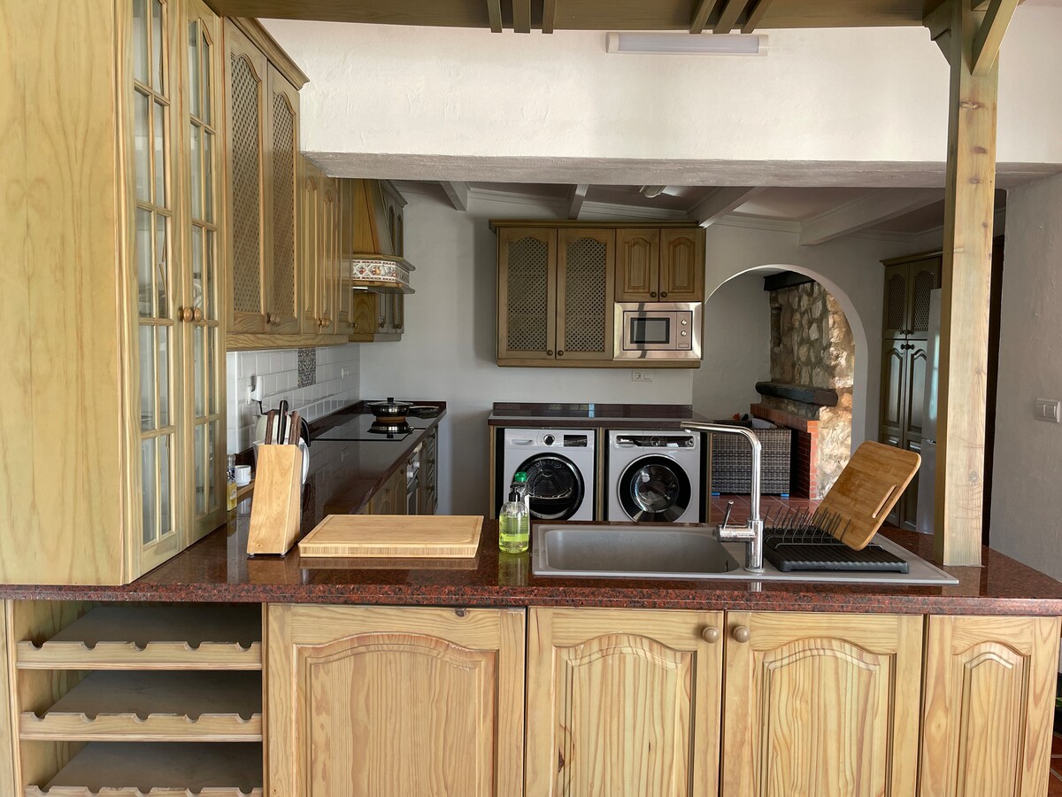 LINN SNÁMHA AGUS TOBÁN TEA AG AN VILLA PRÍOBHÁIDEACH. RADHAIRC IONTACHA AR NA SLÉIBHTE Tá an villa seo suite faoin tuath i measc crann torthaí. Linn snámha gheataithe don rannóg sábháilteachta do pháistí. Tá an linn snámha téite, tá costais na linne snámha san áireamh ach amháin ó mhí na Samhna go dtí deireadh mhí Feabhra (bíonn an tobán te in úsáid). San iomlán, tá spás codlata sa villa do 12 dhuine móra agus 2 naíonán, agus beidh 4 acu sin sa seomra teaghlaigh sa bhfoirgneamh cóngarach. Dhá cheann ar dhá leaba thoilg. Wi-Fi. Maide teilifíse le Disney agus Netflix 20 nóiméad sa charr go haerfort Malaga, 5 nóiméad sa charr go dtí an baile is gaire, Alhaurin De La Torre. Thart ar 15 nóiméad sa charr go dtí an trá.