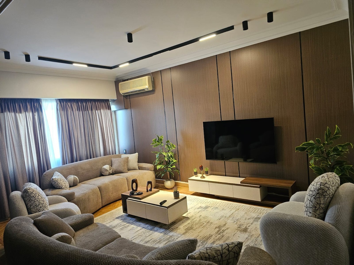 Modern Appartment front nile river 2-bedroom apartment next to the Holiday Inn. Enjoy a direct Nile view from a private balcony. Fully air‑conditioned, with oil heaters, two bathrooms, and a fully equipped kitchen. The living room features a 65-inch Smart TV with Netflix, Amazon Prime, live sports, and international channels. Fresh towels and bed linens provided for a comfortable stay.