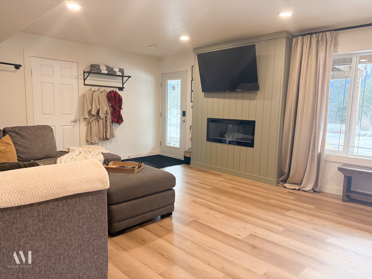 Déan iniúchadh ar an áisiúlacht agus ar an tsuaimhneas i dtearmann 3 - bdrm nua - aimseartha nuathógtha, gan ach tiomáint 5 nóiméad ó lár Golden. Laistigh d'achar siúil ón Golden Skybridge, tá radharc iontach sléibhe ar fáil sa teach seo ina bhfuil cistin lánfheistithe chun áthas na cócaireachta a bhlaiseadh. Glac le scíth cois an teallaigh, áit a n - athraíonn tolg fairsing ina leaba phluise. Cuir tú féin sa tobán te príobháideach le radhairc iontacha, faigh blaiseadh d'oícheanta suaimhneacha inár leapacha sómasacha. Tá an saoire ghearr ag fanacht leat!