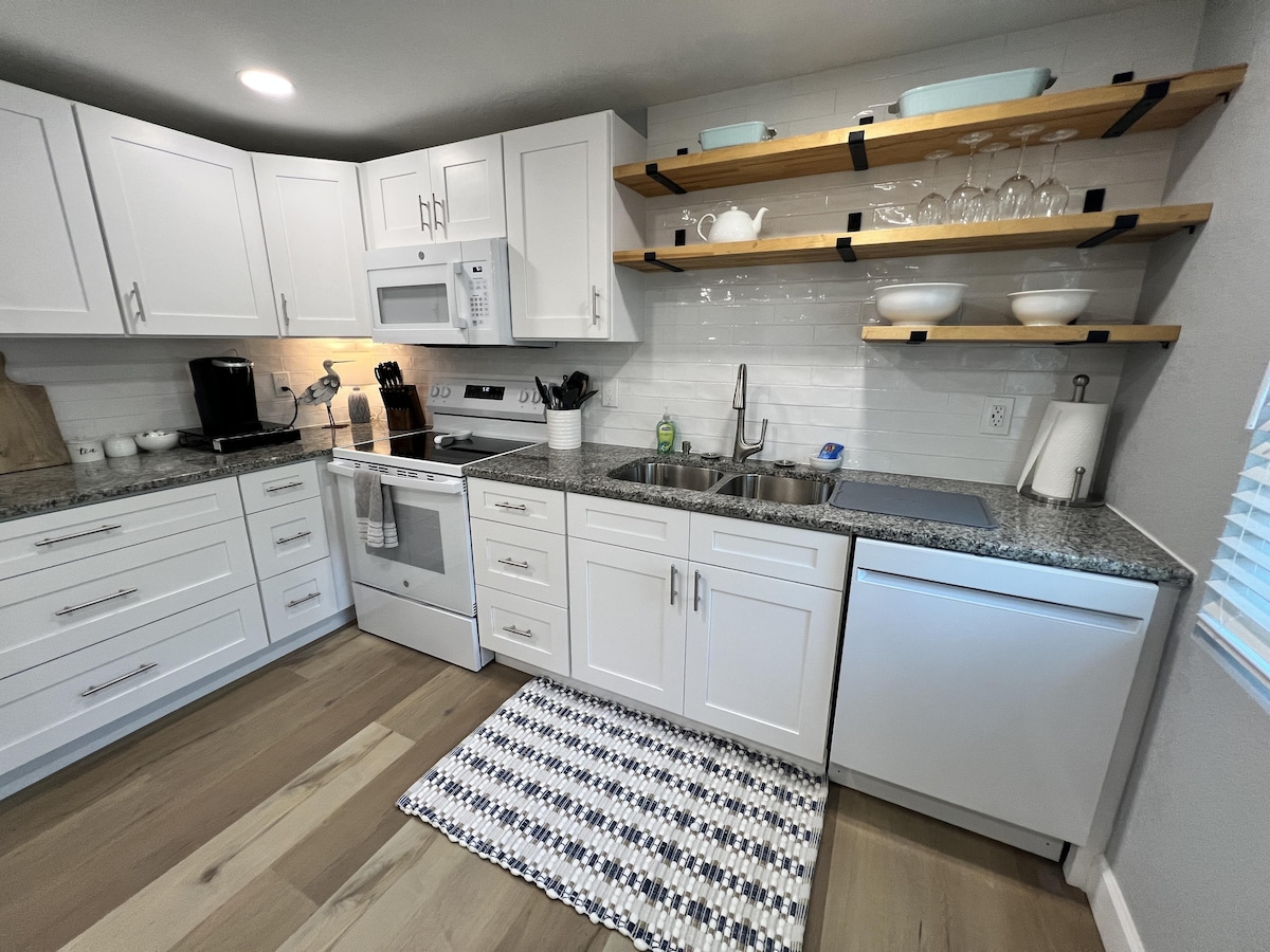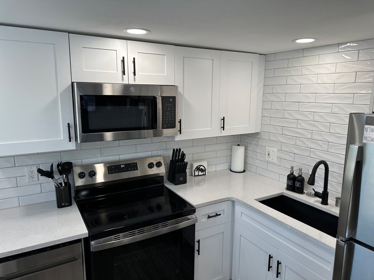 Bain sult as go léir - Linn snámha, duga príobháideach agus rochtain phríobháideach ar an trá in aice le bialanna. Páirceáil clúdaithe nó hop ar thointeálaí chun iniúchadh a dhéanamh ar Manasota Key! Tá árasán geal éadrom críochnaithe le gach rud a bheidh uait chun do scíth a ligean. Tá an friochtán aeir, an sorn iniompartha, an déantóir caife, an citeal agus an gríoscán pobail go léir sa chistinéad. Bain sult as leaba bhanríona, tolg leapa iomlán, cithfholcadán agus meaisín níocháin/triomadóir comhroinnte. Téigh ag iascaireacht ón gcé, cuir duga in áirithe nó féach ar an trá phríobháideach. Gar do gach rud!!