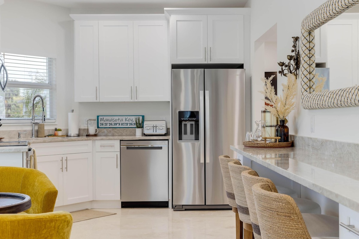 Suíomh Galánta ar Phríomhoileán - Bain sult as an suíomh is fearr ar an oileán lenár dteach atá oiriúnach do theaghlaigh agus do pheataí (teastaíonn cead le haghaidh peataí agus táille $200/peata). Níl le déanamh ach céimeanna ónár dtrá phríobháideach & 1 mhíle ó bheáir agus ó bhialanna, le seirbhís tointeála saor in aisce chuig tránna, bia agus siamsaíocht oíche. Lig do scíth i do chompord w/leapacha boga, tolg fairsing, agus teilifíseáin chliste ar scáileán cothrom i ngach seomra & Wi - Fi tapa. Cuirimid rothair agus trealamh trá ar fáil. 1 mhíle ó thrá phoiblí Manasota Key. Déan áirithint anois don tearmann oileáin is fearr!