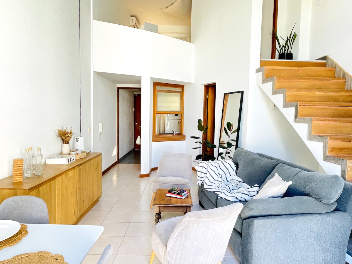 Dúplex tipo loft que combina calma y diseño, a sólo dos cuadras del Hospital Español de La Plata, y 10 minutos del estadio único. A/A frío calor, WiFi 114 mbps, full equipado. En planta baja: living comedor de doble altura con estación de café/té. Baño de categoría con ducha. Cocina totalmente equipada. Amplio balcón con vista a pulmón verde. En planta alta: área de trabajo con mucha luz natural, cama queen, placard espacioso y TV con Netflix.