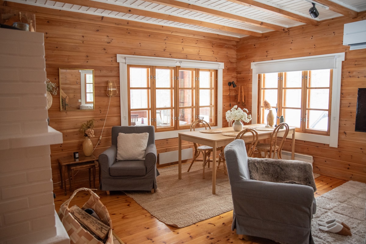 Níl ach 35 nóiméad sa charr ó Heilsincí ná ár dTeach teachín beag i bhforaois Kekkapää. Saoire ghearr rómánsúil iontach ag an deireadh seachtaine más mian leat blaiseadh a fháil de sabhna adhmaid príobháideach, de thuath Espoo, agus den dúlra in aice láimhe. Táimid suite laistigh d'achar siúil ó Myllyjärvi, chomh maith le seirbhísí spá mainéir agus bialainne Backby. Tá madraí, capaill, cat agus sicíní ar ár bhfeirm. Tá an teach deartha ag teaghlach ailtire dóibh féin.